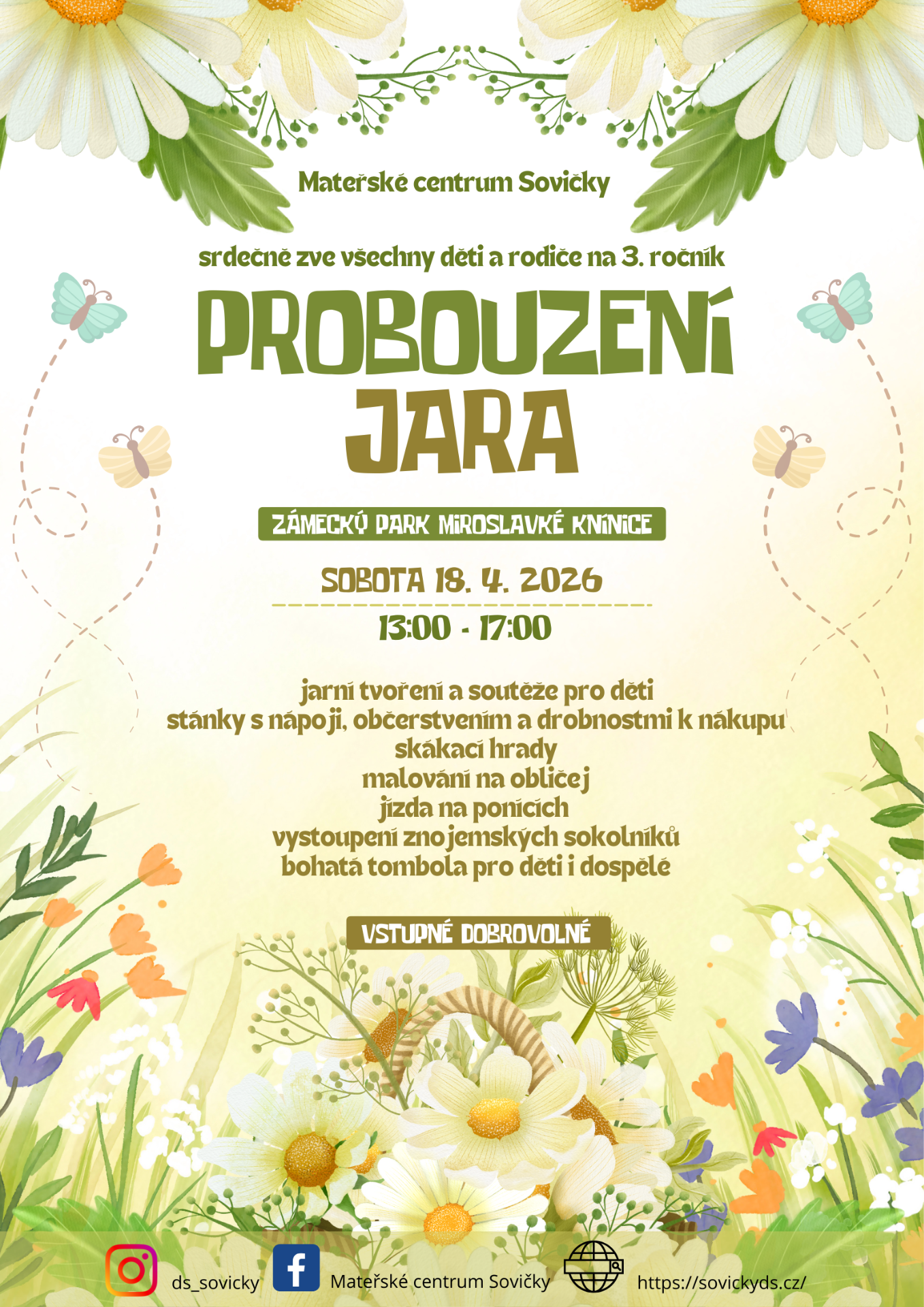 Na letošním, již tradičním, Probouzení jara v zámeckém parku v Miroslavských Knínicích se opět můžete těšit na jarní tvoření a soutěže pro děti, stánky s občerstvením, občerstvení pro děti zdarma, také skákací hrady, malování na obličej nebo jízdu na ponících.